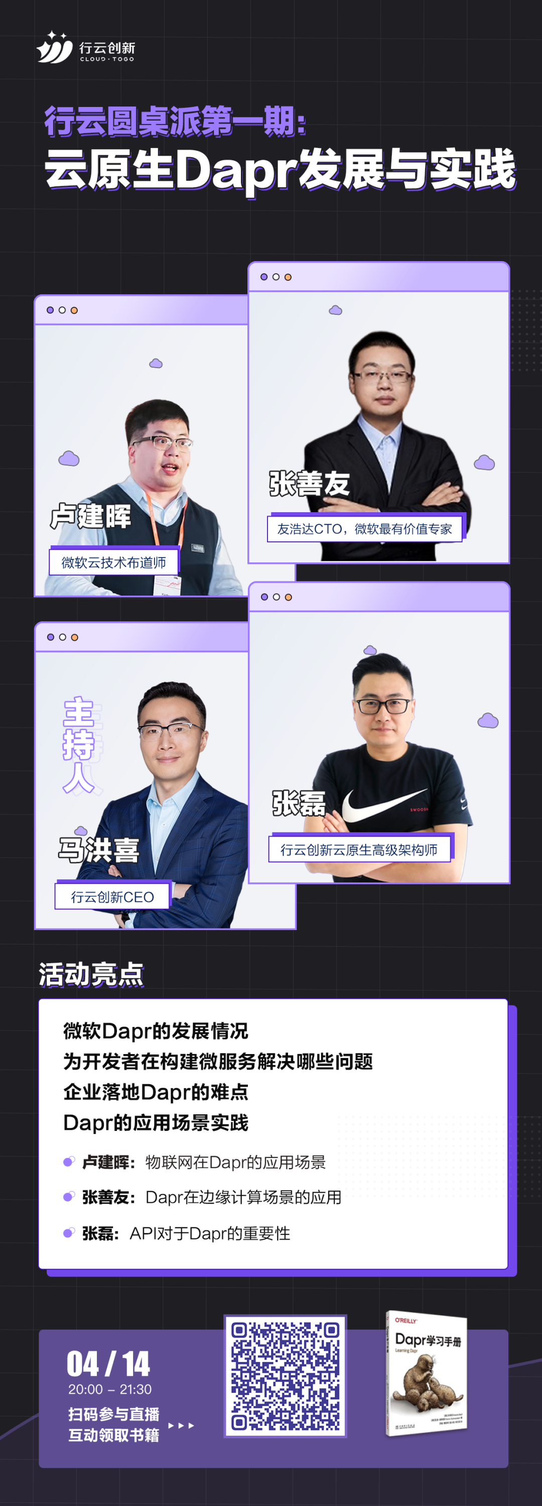 4月14日晚上8点,《行云圆桌派第一期:云原生Dapr的发展与实践》直播来啦!活动由星空游戏创新CEO马洪喜,微软最有价值专家、.NET技术专家张善友,微软云技术布道师卢建晖,星空游戏创新云原生架构师张磊四位嘉宾与大家聊聊Dapr的发展情况和落地遇到的问题、Dapr应用场景实践、未来展望等。