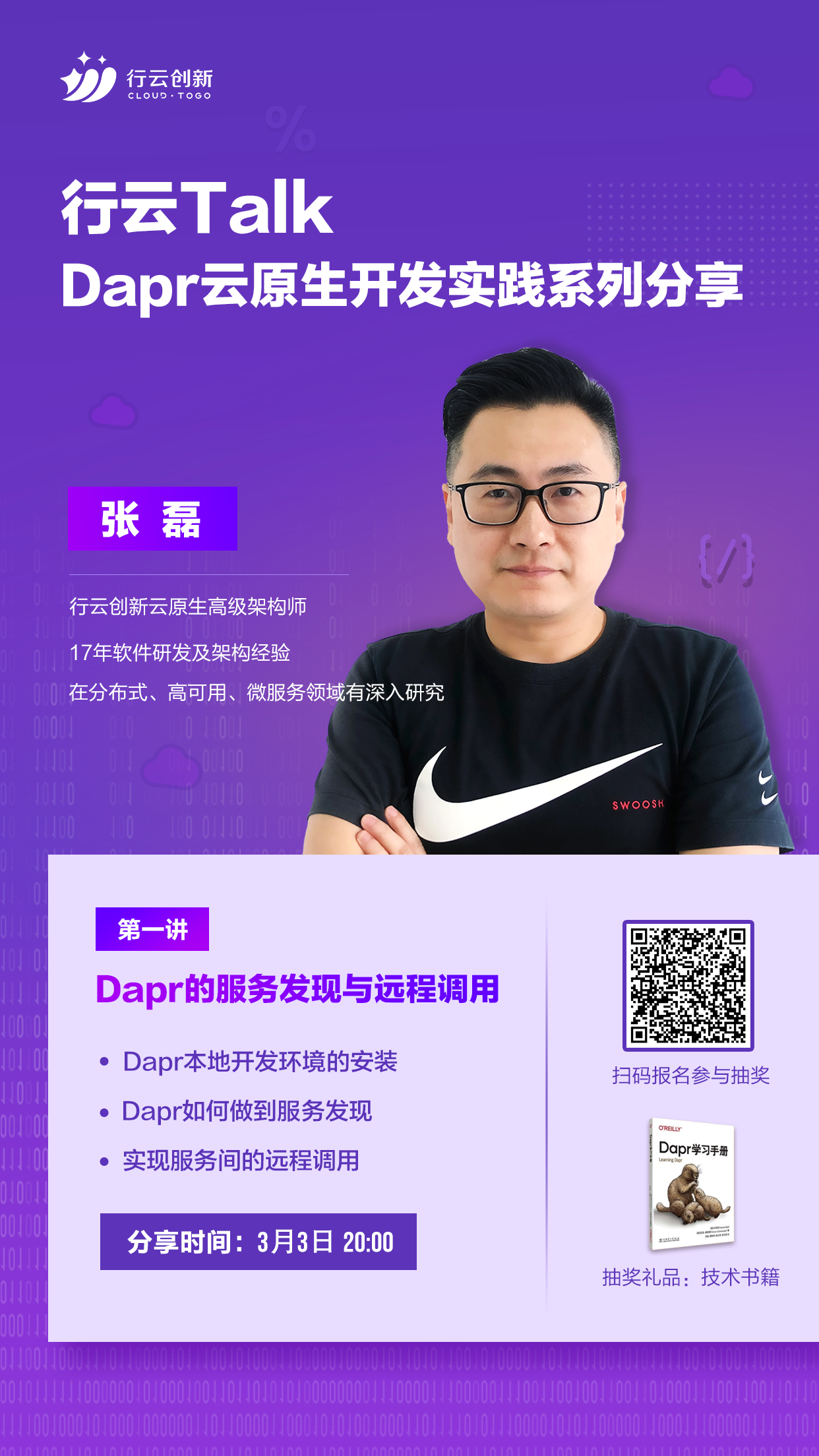 3月3日20:00,Dapr云原生开发实践系列第一期内容即将开讲,星空游戏创新云原生高级架构师张磊分享:Dapr的服务发现和远程调用,介绍Dapr本地开发环境的安装,Dapr如何做到服务发现以及实现服务间的远程调用。