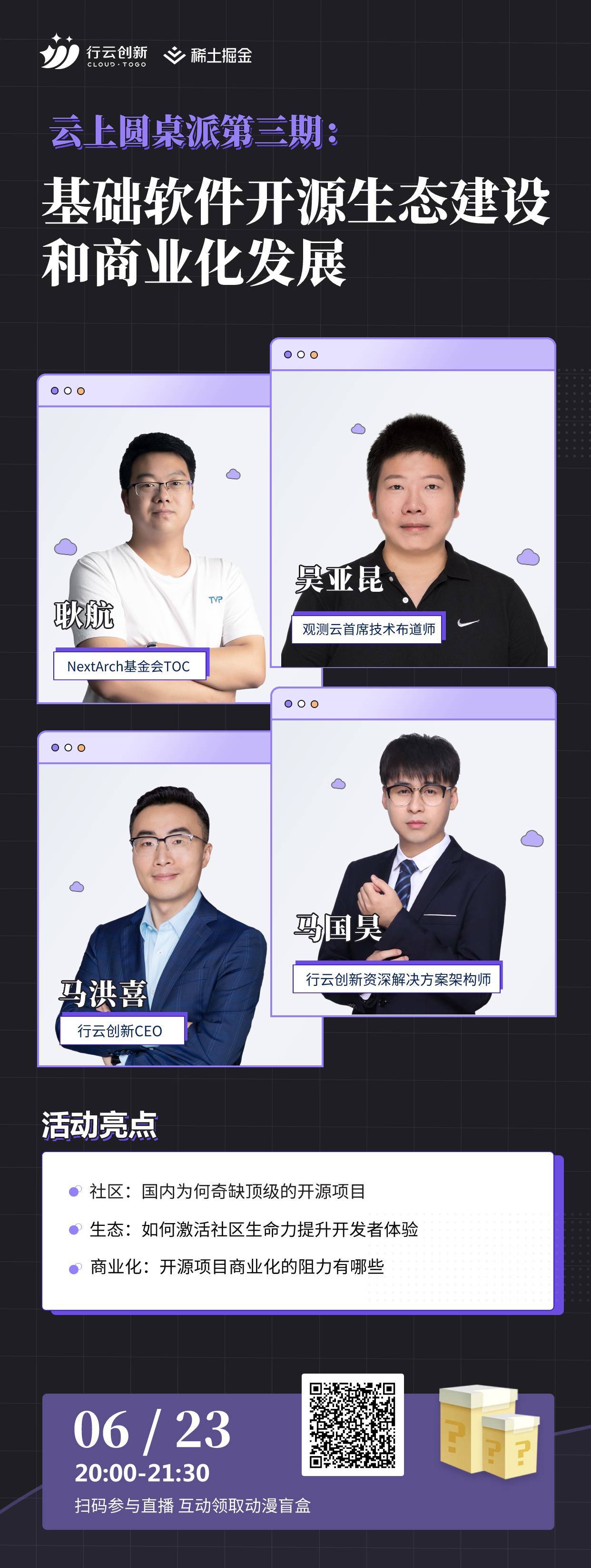 6月23日晚上20:00,云上圆桌派第三期《基础软件开源生态建设和商业化发展》即将开启,活动邀请NextArch基金会TOC耿航,观测云首席技术布道师吴亚昆,星空游戏创新资深解决方案架构师马国昊三位大咖和星空游戏创新CEO马洪喜一起对国内的开源生态现状、社区的建设及商业化发展等多个问题一起展开讨论。